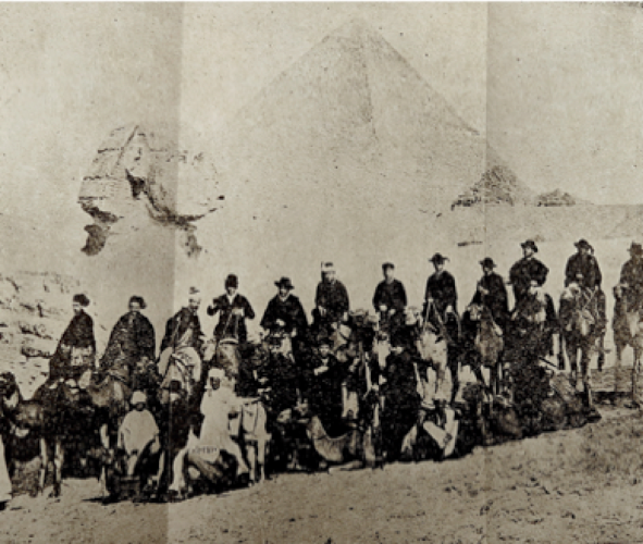Un fotógrafo acompañaba a los casi treinta peregrinos que viajaron a Egipto y Palestina en 1898 (relatado por los presbíteros Basurto). A pesar de la mala contextura, la fotografía captura el gesto beato de un sacerdote no identificado. Él, en la fila inferior al costado izquierdo de un egipcio, no monta en camello, sino que, sobre un burro blanco, reactualiza —casi eucarísticamente— la «Huida a Egipto» de la Sagrada Familia cuando ésta sale, según la Tradición de Mateo 2:13-23, en lomos de un asno, de la Judea de Herodes. Vemos, aquí, a esos viajeros mexicanos con dos lógicas combinadas: son viajeros que insisten en peregrinar, a la usanza tridentina, pero que, a su vez, viven en tiempos de Modernidad porfiriana, para la cual la fotografía fue un elemento imprescindible.