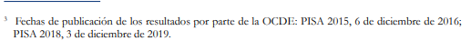 • Ciclo de PISA: PISA 2015 (entre el 1 de enero de 2015 y el 2 de diciembre de 2019) y PISA 2018 (desde el 3 de diciembre de 2019 en adelante).