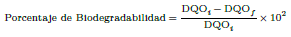 Aireadora con una capacidad de oxigenación 1200 cc/min y dos difusores de burbuja fina, se adicionaron 5 mL de macronutrientes, 5 mL de micronutrientes y 5 mL de microorganismos aerobios provenientes de una planta de tratamiento de aguas residuales domésticas. Esta agua se denominó agua de dilución. Para las muestras se prepararon balones volumétricos de 500 mL con una dilución de la muestra calculada a partir del valor de la DQO inicial, se aforó con agua de dilución y se llenaron los winkler. Para el blanco se llenó un winkler con agua de dilución. Las muestras fueron incubadas por períodos de 14 días, en cada día se destapaba una muestra para analizar la DQO y de esta manera calcular el p orcentaje de biodegradabilidad, mediante la Ecuación (1):