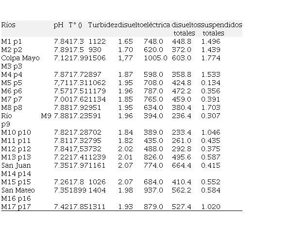 Se tomaron un total de 17 muestras de agua en varios sitios del área objeto de estudio y se realizaron estudios para estudiar los parámetros físicos y de agregación que se presentan en la tabla 1 que se muestra a continuación.