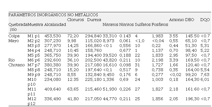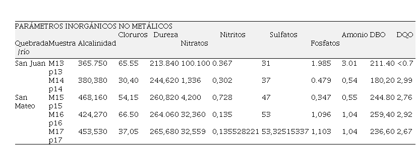 Entre los parámetros inorgánicos no metálicos que están en los valores aceptables están: la alcalinidad, los cloruros, la dureza, los nitratos, los nitritos, los sulfatos y la demanda química de oxígeno y quienes no están en los valores correctos son: los fosfatos, el amonio, y la demanda química de oxígeno.
