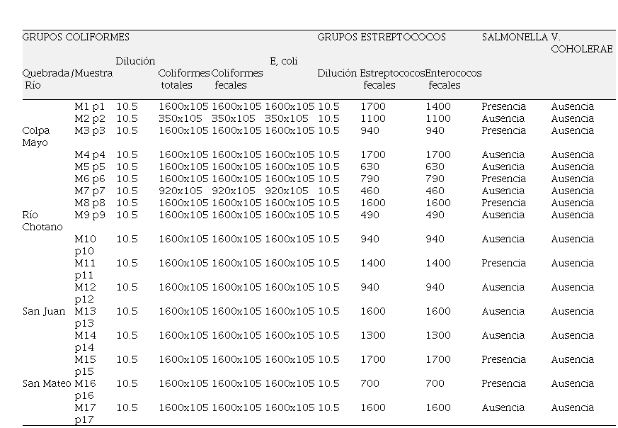 Se presentan a continuación los análisis microbiológicos de las aguas residuales conformados por 4 grupos donde el primero formado por los coliformes con sus parámetros: dilución, Coliformes totales, Coliformes fecales y E. Coli. El segundo conformado por los estreptococos con: dilución, estreptococos fecales, esterococos fecales y finlmente se presentan Salmonela y V. Coholerae.