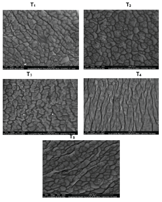 Concerniente a la cantidad de estomas por tratamiento que se detalla en la tabla 7, se determinó que en índice estomático el T4 obtuvo 39.13 % y se diferenció a 36.11 % con respecto al T1 con 25 %. Asimismo, este tratamiento obtuvo mayor rendimiento en el cultivo de rabanito. Por lo tanto; en este porcentaje de estomas las reacciones bioquímicas incrementaron la formación de carbohidratos obteniéndose mayor rendimiento en condiciones edafoclimática de suelo franco arenoso y Temperatura de 20 a 25 °C. Otras investigaciones se ha observado que entre el patrón de estomas, la ruta fotosintética y hábitat brindan claro ejemplo de la interacción entre los rasgos anatómicos, innovación fisiológica y adaptación ecológica de las plantas (20). Asimismo, el factor el incremento de la salinidad disminuyó el número de estomas en la superficie abaxial de las láminas foliares (21). En condiciones edafoclimática adversas como menor humedad en el aire, precipitaciones y suelo con mayor densidad aparente, resultaron estomas más pequeñas y menor densidad estomática (22).