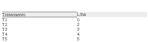 Para establecer las dosis de lixiviado que se detalla en la Tabla 1, se tuvo en cuenta el análisis de suelo, del abono foliar y la cantidad que aplican los agricultores que en promedio es de 2 a 4 l de lixiviado /200 l de agua/ ha, para cultivo de rabanito. Cabe mencionar que en otras preparaciones se mezclan minerales: fósforo, potasio, boro, magnesio y silicio, se deja fermentando 15 días más y se aplica 300 cc /bomba 18 l de agua como fertilizante foliar (7).