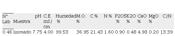 Respecto al análisis químico del lixiviado que se detalla en la Tabla 4, se aprecia una concentración baja de materia orgánica, nitrógeno, fósforo y potasio. Sin embargo estos porcentajes, se encuentran dentro de los valores del abono de animales como de vaca y de abono foliar a base de residuos de casa y hojas de plantas (13).
