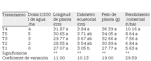 De acuerdo a las evaluaciones de las características físicas del cultivo de rabanito que se expone en la tabla 3, se determinó que no hubo significancia; es decir, las dosis de lixiviado no influyeron estadísticamente en tamaño de planta, rendimiento, diámetro; sin embargo, la dosis de T4 con 4 l de lixiviado/ 200l de agua destacó en el incremento del rendimiento a 44.58 % en relación al T1 (testigo). Por lo que, esta dosis es adecuada para obtener mayor rendimiento; puesto que, se incorporó nutriente para el desarrollo de la planta, que por problemas de estrés y plagas no fueron absorbidos de manera óptima. Es importante mencionar que en otras investigaciones de la fertilización foliar en cebolla de bulbo se concluyó que el efecto responde a mejorar los rendimientos en biomasa y calidad. (16). Asimismo, la fertilización foliar no reemplaza a la fertilización convencional en los cultivos; sino más bien asegura el aporte de nutrientes que el suelo no suple y complementa para satisfacer las necesidades bioquímica y fisiológica de la planta (17)
