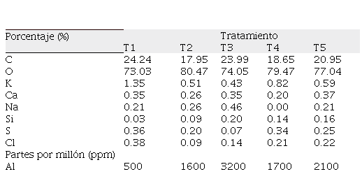 También se determinó que el T5 destacó en los elementos de oxígeno, calcio, silicio y aluminio y disminuyó el carbono, potasio, azufre, cloro; sin embargo, estas concentraciones no influyeron en el rendimiento; puesto que el T4 destacó con relación a los demás tratamientos.