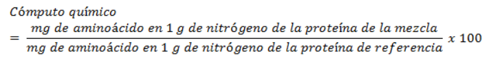 Se realizó el cálculo del score de aminoácidos o cómputo químico de las mezclas utilizado los aminogramas de cada componente. Los aminoácidos considerados fueron basados de acuerdo a las recomendaciones de la FAO/ OMS (20), teniendo presente el cálculo del aminoácido limitante.