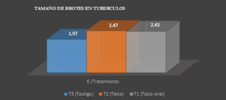 Con respecto al tamaño de los brotes esto también de manera similar fue afectado por los daños del estadio larval de las polillas de la papa exteriorizando: con cobertura a base de talco “silicato de magnesio hidratado”: Mg3 Si O10 (OH)2, un tamaño de brote promedio de 2.47 cm., con cubierta de Talco BT 2.43 cm. mediante el proyecto de investigación (15) reporta en cuanto a la “Validación del uso de Baculovirus para el control de las dos polillas phthorimaea operculella y tecia solanivora en papa almacenada Y. los daños al término del período de almacenamiento en los tubérculos tratados fueron de 0 a 1,2 %, mientras que en los tubérculos sin tratar fue de 5,2 a 39.98%, siendo de menor tamaños los que se desarrollaron en los tubérculos semilla de papa T3 (testigo) sin cubierta 1.97 cm.