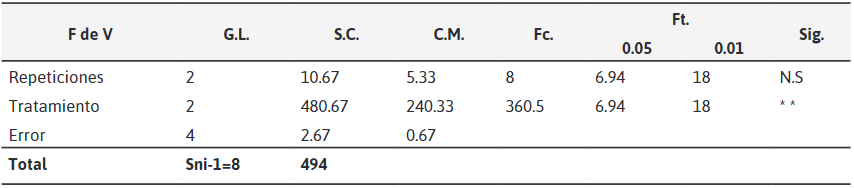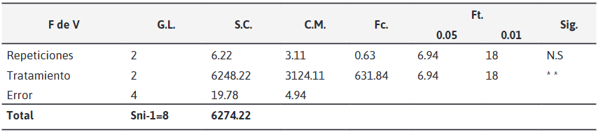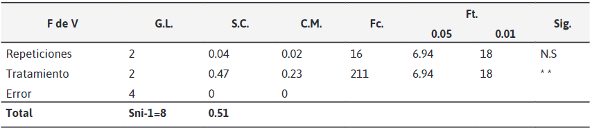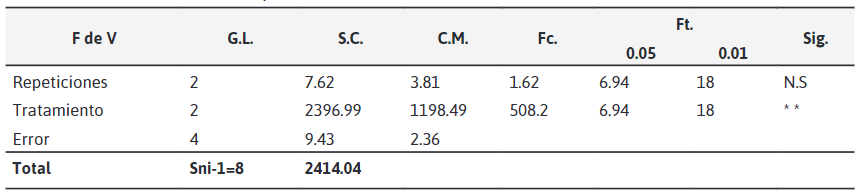 Resultado de los análisis de varianza al 0.05 y 0.01 de los tratamientos, (Tabla 2)