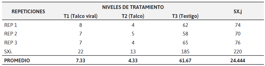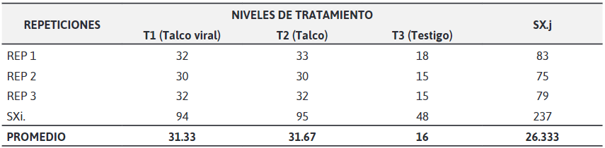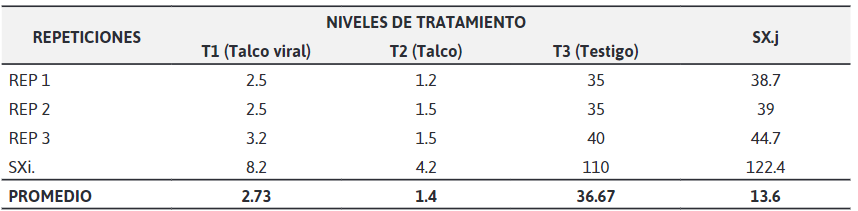 Promedio de los niveles de tratamientos empleando el talco viral para el controlar el porcentaje de daños en tubérculos de papa semilla, (Tabla 1)