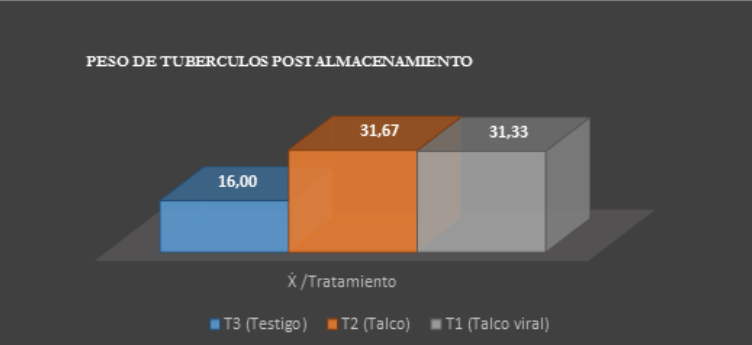 El peso en tubérculos se determinó con aplicación de Talco viral baculovirus BT, tubérculos impregnados con Talco “silicato de magnesio hidratado” Mg3SiO10 (OH)2: comparados con tubérculos sin ningún control, el objetivo es validar la eficiencia y efectividad del Talco viral baculovirus BT, para disminuir la pérdida de peso de los tubérculos semilla de papa almacenados