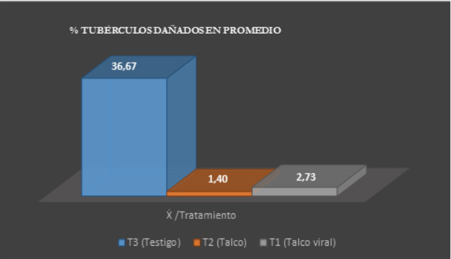 Como se indica en la Tabla 1, el tratamiento de los porcentajes de daño fue el mayor para el T3=36.67, donde se encontró mayor cantidad de ataque de la Larvas de la Polilla de la papa, seguido del uso del talco viral con el porcentaje de 2.73, teniendo el menor daño de los tubérculos el T2=1.4 de porcentaje resultado del uso de talco para se controló el ataque del daño de la polilla