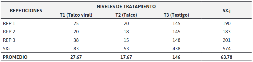 Promedio de los tratamientos de los niveles de uso talco para el promedio de larvas hallada en los tubérculos dañados, (Tabla 4)