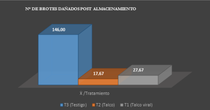 En la Tabla 3 está referida al promedio de brotes dañados de papa semilla almacenados que indican que para T3 = 146, seguido el T1=27.67, ubicando se en último lugar el T2=17.67, respuesta que se presentó en relación al porcentaje de daños en tubérculos por ataque de las polillas, el promedio % de brotes daños manifestó ser mayor en aquellos tubérculos semilla que fueron almacenados de la forma tradicional, se aprecia semillas que fueron almacenados con talco “silicato de magnesio hidratado” Mg3SiO10 (OH)2, manifiesta menor promedio de daño de brotes que los tubérculos que fueron almacenados con Talco BT
