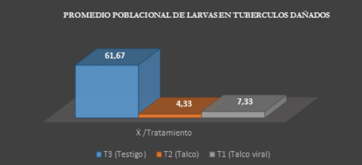 En la Figura 3 el promedio poblacional de larvas halladas en los tubérculos dañados por las polillas observados lo que se manifestaron en una menor presencia de larvas fueron las que tuvieron cubierta de talco” silicato de magnesio hidratado” Mg3SiO10 (OH)2 y Talco BT, sobre saliendo las que fueron recubiertas con talco el T2 con 4.33 de población larval