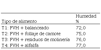 El tipo de dieta alimenticia tuvo efecto sobre el porcentaje de humedad de la carne del cuy, reportándose 77%, 76%, 75% y 72% para la canal de los animales alimentados con FVH + alfalfa, FVH + residuos de molinería, FVH + follaje de camote y FVH + balanceado, respectivamente, con un promedio general de 75% (ver Tabla 4).