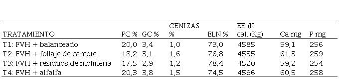 Tal como se muestran en la Tabla 4, el aporte energético de la canal del cuy oscila entre 4520 a 4596 Kcal/kg; de tal manera que la carne de los cuyes tuvo un aporte energético de 4596 Kcal/kg, 4585 Kcal/kg, 4535 Kcal /kg y 4520 Kcal/kg para los que fueron alimentados con FVH + alfalfa, FVH + balanceado, FVH + follaje de camote y FVH + residuos de molinería, respectivamente.