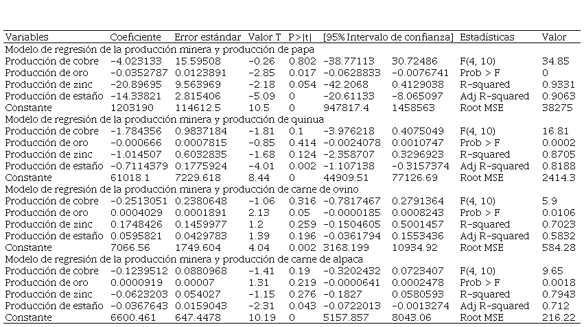Luego de realizar el análisis descriptivo y correlacional de las variables que mineras que explican a la producción agrícola y pecuaria, se aplicaron los modelos econométricos de MCO (Lin-Lin), para explicar el comportamiento de las variables productivas agropecuarias respecto a las variables de producción mineras. Según los resultados que se obtuvieron, destacan un nivel de significancia de 5% y un nivel de confianza del 95%; con evidencias estadísticas significativas de las variables explicativas con relación a la variable dependiente.