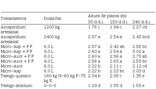 A los 150 días se reportó que los tratamientos Azospirillum artesanal 2400 kg/ha (2.54 m), Micro-Asp 9 L/ha + P.F (2.54 m), Micro-Azot 6 L/ha + P.F (2.56 m) y Micro-Azot 9 L/ha + P.F (2.63 m), fueron estadísticamente iguales y superiores al resto de tratamientos. El registro más bajo se dio sin la aplicación de productos en el testigo con 1.55 m.