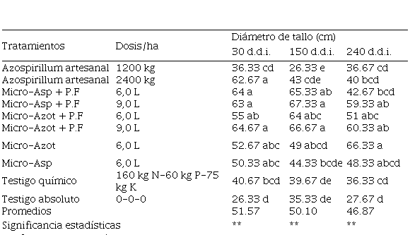 Con las aplicaciones de biofertilizantes y fertilizantes químicos sobre la variedad evaluada, se encontró que influyeron significativamente en altura de planta y diámetro de tallo, esto es debido a que estas características agronómicas son influenciadas por la formación de hormonas reguladoras de crecimiento, esto es corroborado por Jiménez (2008), quien manifiesta que en los últimos años el estudio de microorganismos asociados a plantas ha sido tema de interés para muchos investigadores, por todos los beneficios que estos pueden aportar a las plantas, entre estos: fijación biológica de nitrógeno, producción de hormonas, así como también la influencia de estos en el ecosistema. Así mismo con la inoculación de Azospirillum se observa frecuentemente un mayor desarrollo del sistema radical, el cual se traduce en mayor superficie de absorción de nutrientes, así como en mayor desarrollo de la parte aérea de las plantas. También se han observado incrementos en el contenido de nitrógeno, fósforo, potasio y otros minerales en las plantas inoculadas.