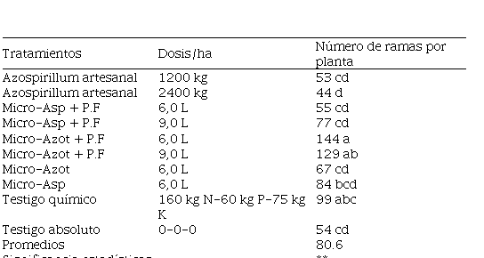 Los promedios de número de ramas por planta encontrados, se muestran en el Cuadro 3. Se presentó alta significancia estadística en la evaluación realizada, siendo el coeficiente de variación 21.68%. El análisis de Tukey determinó que el tratamiento Micro-Azot 6 L/ha + P.F (144), fue estadísticamente igual al tratamiento Micro-Azot 9 L/ha + P.F (129) y superior al resto de tratamientos, registrándose el promedio más bajo con la aplicación de Azospirillum artesanal en dosis de 2400 kg/ha con 44 ramas.