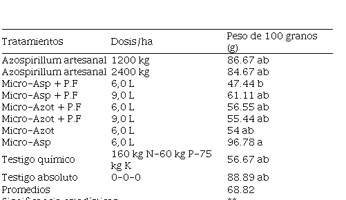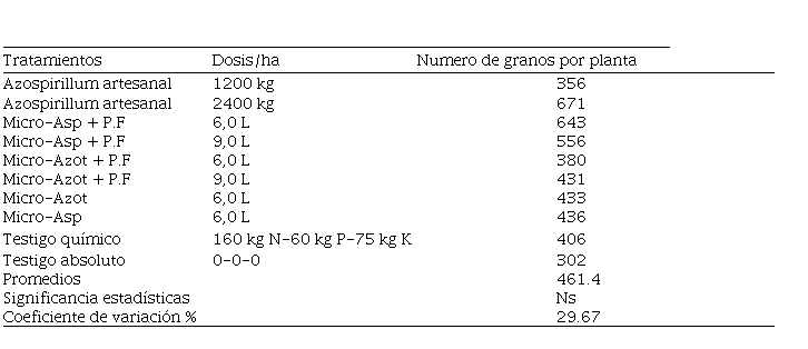 En tabla 4, se observan los promedios de número de granos por planta encontrados. No se encontró significancia estadística obteniéndose un coeficiente de variación de 29.67%. El tratamiento con mayor número de granos por planta fue Azospirillumartesanal en dosis de 2400 kg/ha con 671 granos/planta, presentándose menor cantidad de granos en el testigo con 302 granos/planta.