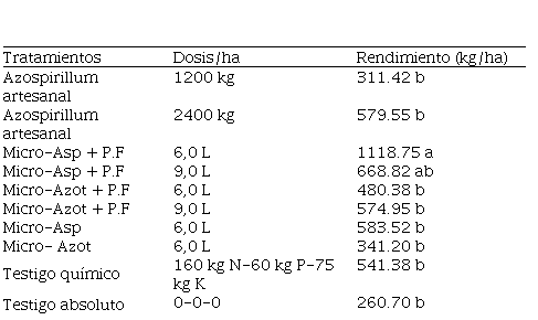 Los rendimientos presentados fueron aceptables dadas las condiciones de la zona. Los rendimientos alcanzados para la variedad alcanzaron su tope más alto con la aplicación de la fertilización y Azospirillum (1118.75 kg/ha), las que superan considerablemente la producción media nacional y a los demás tratamientos. Los resultados alcanzados con la utilización de fertilizantes sin la aplicación de la bacteria no superan a la mezcla de estos con fertilización convencional.