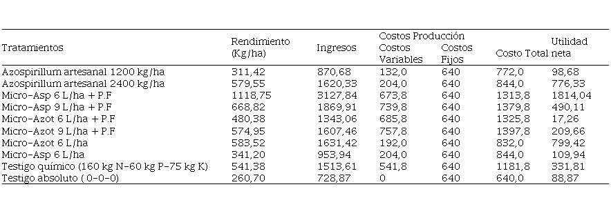 El análisis económico realizado a los tratamientos del ensayo, se registran en la tabla 7. El tratamiento Micro-Asp 6 L/ha + PF presentó la mejor utilidad con $1814.04, habiéndose encontrado la menor utilidad en Micro-Azot 6 L/ha + PF con $17,26.