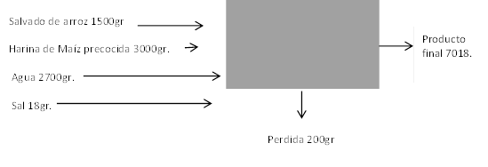 Recepción y pesaje: La harina de maíz precocida y el salvado de arroz es previamente obtenidos junto con los demás insumos para desarrollar el producto por esta razón se inspeccionan y pesan atendiendo a las formulaciones (Ver tabla N° 3) preservando que estén libres de cualquier impureza o sustancia extraña que pueda perjudicar el proceso disminuyendo la calidad del producto final y revisando tarjetas de expedición.