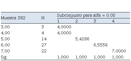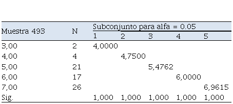 Diferencias significativas entre las muestras mediante la aplicación del análisis estadístico SPSS aplicando la prueba Dunca entre la muestra 382 y 493