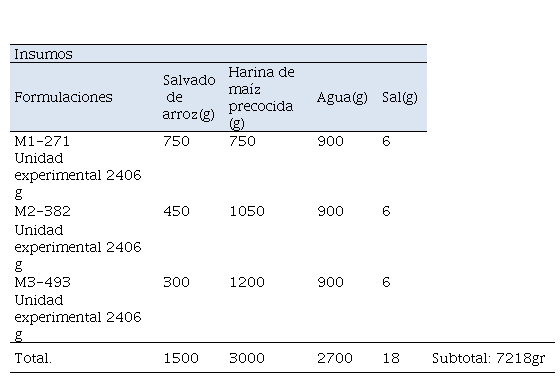 Para los materiales se usó la harina de maíz precocida que fue donada por la empresa APARCA C.A, cabe destacar, que el salvado de arroz también fue donado por el comerciante informal Luis Hernández. Se formularon tres muestras utilizando el salvado de arroz de la siguiente forma: 50, 70 y 80%.