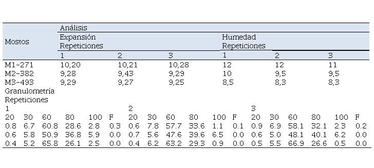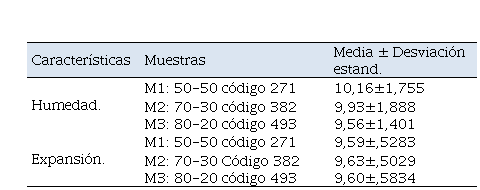 La tabla 2 se muestra los resultados en cuanto a las valoraciones de la harina de maíz precocida con salvado de arroz tomando como parámetros la expansión, humedad y granulometría de tres muestras aleatorias, las mismas se formularon utilizando el salvado de arroz de la siguiente forma: 50, 70 y 80%.