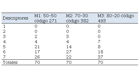 En este sentido, también podemos confirmar que las muestras dos (70-30) y tres (80-20) presentan diferencias significativas, se pueden observar los valores distribuidos individualmente en cada columna del uno al cinco.
