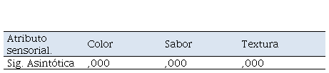 En atención a los resultados se puede concluir que existen suficientes evidencias para aceptar la hipótesis nula, es decir, no existen diferencias significativas en cuanto al sabor de las arepas elaboradas con las distintas concentraciones 50-50, 70-30, 80-20. Se puede observar el valor sig=0,000 que es un valor menor que el nivel de significancia 0,05. (Tabla 10)
