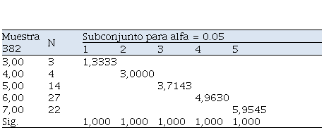 Aplicando Duncan mediante el análisis estadístico SPSS podemos confirmar que las muestras 271 y 382 presentan diferencias significativas, se pueden observar los valores distribuidos individualmente en cada columna del uno al cinco. (Tabla 7).