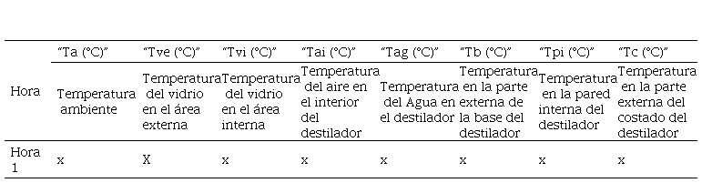 El incremento de la temperatura en el interior del destilador solar indujo la evaporación de una porción del agua de mar. El vapor generado, al entrar en contacto con la superficie interna del vidrio de la cubierta, se condensó en forma de gotas de rocío destilado. Estas gotas se deslizaron a lo largo de la pendiente de la cubierta y fueron guiadas por un canal de recolección hacia el recipiente de almacenamiento del destilado. Para la captura de los datos de temperatura en el destilador solar de una sola vertiente, se empleó el dispositivo Multilog pro.