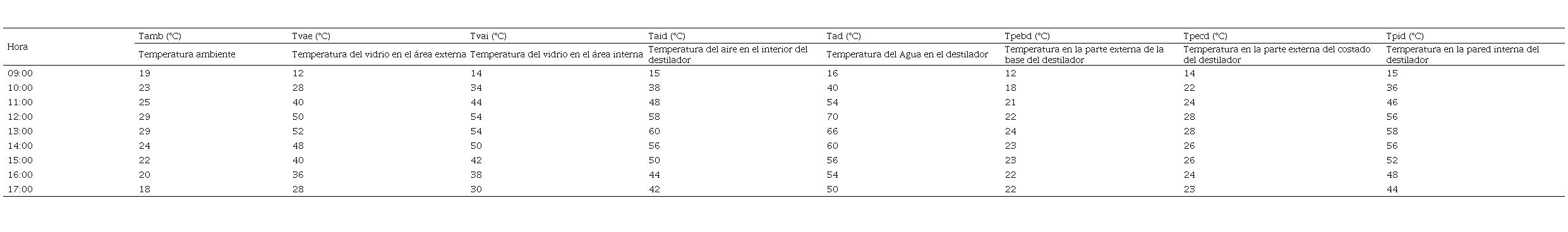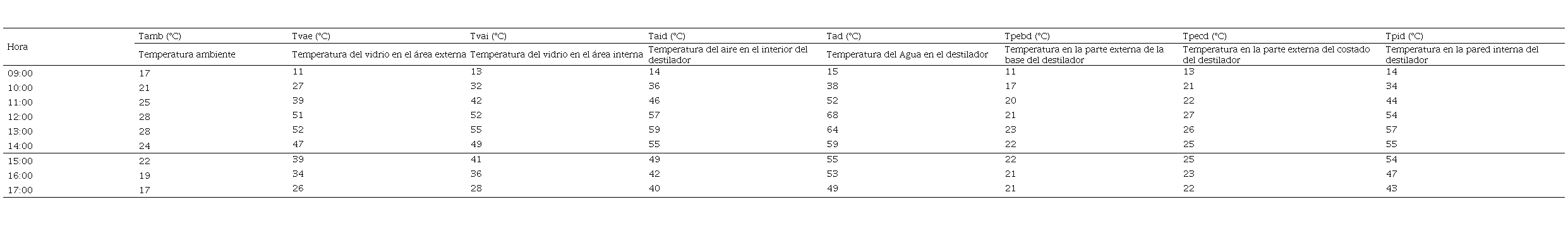 Pruebas experimentales realizadas en el sistema Destilador Solar Tipo una sola vertiente. Se llevaron a cabo pruebas experimentales en la playa Punta Lomitas. Estas pruebas se realizaron desde las 9:00 hasta las 17:00 horas, durante el período de mayor intensidad de radiación solar. Durante este lapso, se monitorearon diversos parámetros, como la temperatura ambiente (Tamb), la temperatura del vidrio en el exterior (Tvae), la temperatura del vidrio en el interior (Tvai), la temperatura del aire dentro del destilador (Taid), la temperatura del agua en el destilador (Tad), la temperatura en la parte externa de la base del destilador (Tpebd), la temperatura en la parte externa del costado del destilador (Tpecd), la temperatura en la pared interna del destilador (Tpi) y la cantidad de agua purificada producida.