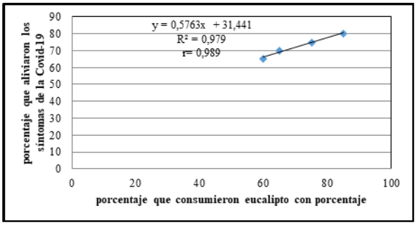 Efectuado el análisis de correlación del porcentaje del consumo de eucalipto con relación al porcentaje de alivio de los síntomas de la Covid-19, que se observa en la Figura1, indica que la tendencia es positiva y el coeficiente de correlación (r) r= 0,989; lo cual se interpreta que hay una asociación alta entre las dos variables; es decir que el incremento del consumo de eucalipto como infusión o combinando con otras hierbas medicinales favorece en el alivio de los síntomas de afecciones respiratorias