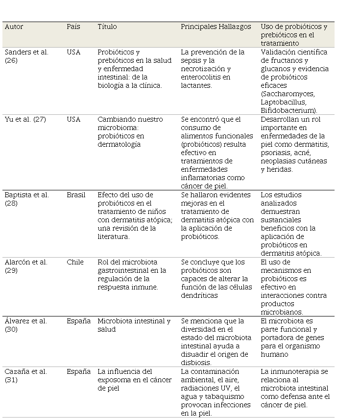 Además, el gran avance de la tecnología molecular ha permitido conocer a detalle el microbiota y caracterizarle de acuerdo a la funcionalidad y a su interacción con el huésped. La aplicación de esta tecnología ha permitido profundizar el estudio de la flora intestinal, así como la relación con la salud y la enfermedad. Sin embargo, la falta investigación y personal capacitado sumado a esto la falta de tecnología en los países de vías de desarrollo no ha permitido ampliar el conocimiento en esta área. Por lo tanto, el objetivo de esta revisión es analizar el uso de probiótico y prebióticos en el tratamiento de patología cutáneas.