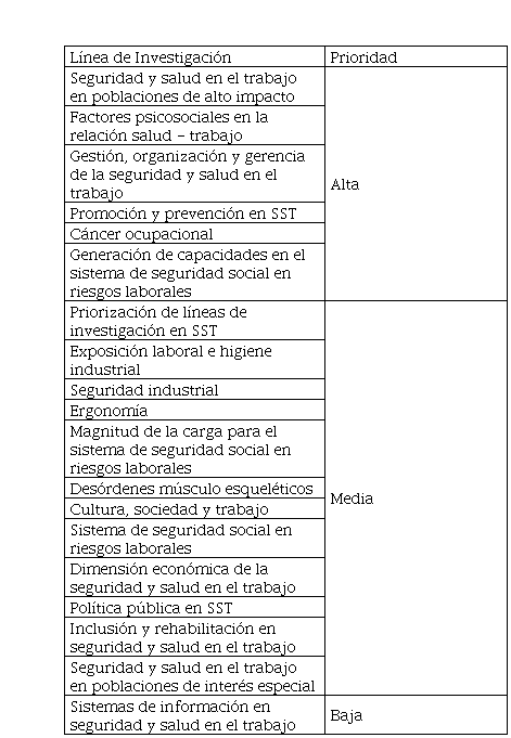 En el caso colombiano, el Ministerio de Trabajo, el Instituto de Evaluación Tecnológica en Salud (IETS) y el Instituto Nacional de Salud (INS), tomando como antecedentes: el artículo 29 de la ley 1562 que establece la realización de un proceso de priorización de investigación en salud laboral para Colombia, el Plan Nacional de Seguridad y Salud en el Trabajo 2013-2021 que fija como uno de los objetivos a alcanzar, la promoción de la investigación en seguridad y salud en el trabajo en el propósito de fomentar la transversalidad de la seguridad y salud en el trabajo en el conjunto de políticas públicas, y el Plan Decenal de Salud Pública 2012- 2021: dimensión salud y ámbito laboral, que establece la necesidad de desarrollar líneas de investigación en salud en el ámbito laboral, ha desarrollado un proceso de priorización de líneas de investigación en salud laboral para Colombia. Instituto Nacional de Salud (INS) (2017).