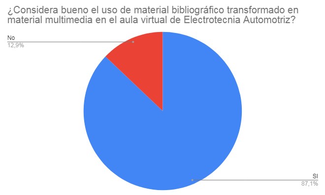 Aceptación de las narrativas digitalesEn la figura N. 2 se evidencia la respuesta de 31 estudiantes donde el 87.1% de los estudiantes consideran adecuado el uso de material multimedia como videos, audios, animaciones, presentaciones en lugar del material bibliográfico tradicional. Se puede observar que 12.9% siguen estando de acuerdo al uso de libros, textos y pdf como instrumentos para el desarrollo de la asignatura.