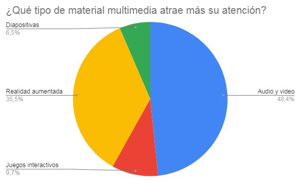 Material multimediaEn la figura N. 3 se puede observar que la mayoría de estudiantes siendo el 48.4%, responde audio y video como el material multimedia que más atrae su atención. El 35.5% respondieron que es la realidad aumentada las más didáctica. A continuación, el 9.7% opta por los juegos interactivos y el 6.5% por las diapositivas. Así pues, se evidencia que los videos tutoriales como narrativas digitales son las estrategias que mejor favorecen los procesos de enseñanza-aprendizaje. Siendo los videos tutoriales los más utilizados por los educandos.