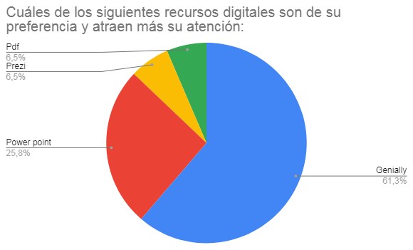 Recursos digitalesEn la figura N.4 el 61.3% de los estudiantes ha seleccionado la plataforma Genially como el recurso digital que más atrae su atención. El 25.8% ha optado por las diapositivas de power point, a continuación, el 6.5% prefiere las presentaciones realizadas en el recurso Prezi. Finalmente, el 6.5% elige los documentos pdf como una herramienta didáctica de su preferencia.