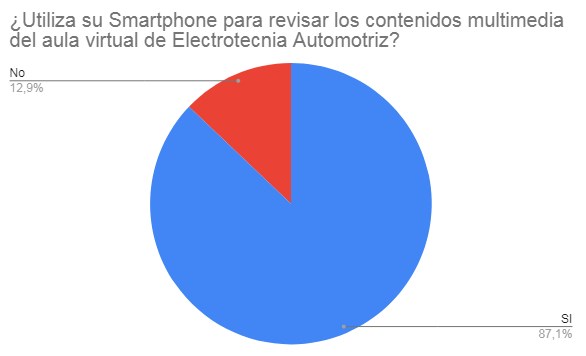 Uso de smartphoneEn cuanto al uso de dispositivos electrónicos, en la figura N. 5 se puede identificar que el 87.1% acceden a la información enlazada en la plataforma a través de su Smartphone. El 12.9% no hace uso de tecnología móvil para revisar los contenidos hipermedia disponibles en el aula virtual. Mediante esta información se conoce que la mayoría de estudiantes, tienen acceso a los contenidos de manera continua por medio de sus teléfonos móviles. La consecución apropiada de conocimientos a través del aprendizaje ubicuo.