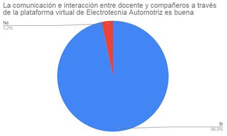 Interacción docente - estudiantesLa figura N. 6 permite observar que la mayoría de los estudiantes el 96.8 % responde que, si existe una buena comunicación e interacción entre docente y compañeros, a través del sistema de gestión del aprendizaje. El desarrollo del prototipo presenta varias ventajas, entre las principales permite una comunicación constante entre los usuarios, que puede complementarse con otros recursos y dispositivos tecnológicos.