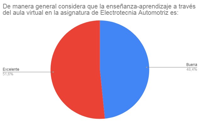 Enseñanza - aprendizajeEn figura N. 7 de acuerdo al criterio del 51.6% de los estudiantes, se determina excelente la enseñanza-aprendizaje a través del aula virtual de electrotecnia automotriz. El 48.4% de estudiantes considera bueno el proceso educativo por medio de la plataforma. Esta información confirma los buenos resultados de aprendizaje obtenidos durante el periodo académico y motiva al desarrollo y mejora continua de los sistemas de gestión de aprendizaje.