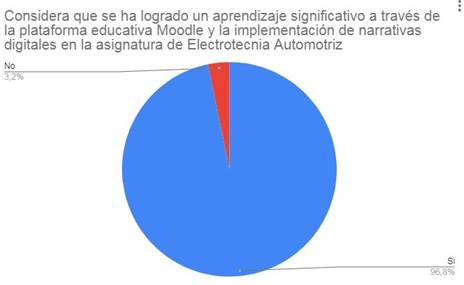 Aprendizaje significativoEn la figura N.8 el 96.8 % de estudiantes responde afirmativamente sobre haber logrado un aprendizaje significativo a través de la plataforma Moodle que implementa narrativas digitales. La utilidad del modelo innovador blended-learning complementa el aprendizaje semipresencial con los encuentros síncronos efectuados a través de plataformas educativas. Así como también el uso de las Tics proporciona a los educandos herramientas adecuadas para brindar facilidad de acceso, interactividad y entretenimiento para la transmisión de conocimientos.