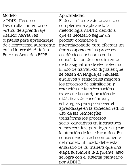 Para efectuar el material educativo virtual se ha decidido emplear el diseño instruccional, con el objetivo de complementar los procesos de enseñanza-aprendizaje de la asignatura electrotecnia automotriz de la carrera de tecnología superior en mecánica automotriz en la Universidad de las Fuerzas Armadas-ESPE. La finalidad de implementar narrativas digitales es aportar de gran manera los procesos de enseñanza, mediante la estimulación visual, auditiva y sensorial para la comprensión de los principios, problemas de aplicación y componentes técnicos de los sistemas eléctricos automotrices. Por lo tanto, se tiene como guía, el modelo de diseño para la enseñanza basada en tecnología: ADDIE (Análisis, Diseño, Desarrollo, Implementación y Evaluación).