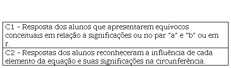Deste modo os alunos foram levados a manipular e analisar a construção no GeoGebra a fim de construir significações, fazer inferências e estabelecer generalizações em relação a equação da circunferência. 25% dos alunos deixou em branco está atividade, no entanto, vale ressaltar que devido sua realização ter sido num segundo momento, parte dos alunos ainda estavam realizando atividades do primeiro momento referente a equação da reta, o que nos leva a considerar a questão do tempo. As respostas da atividade foram agrupadas (Quadro 6) em duas categorias C1 e C2, referente as conclusões do par de números reais “a” e “b” e o número real r nas representações geométricas e algébrica.